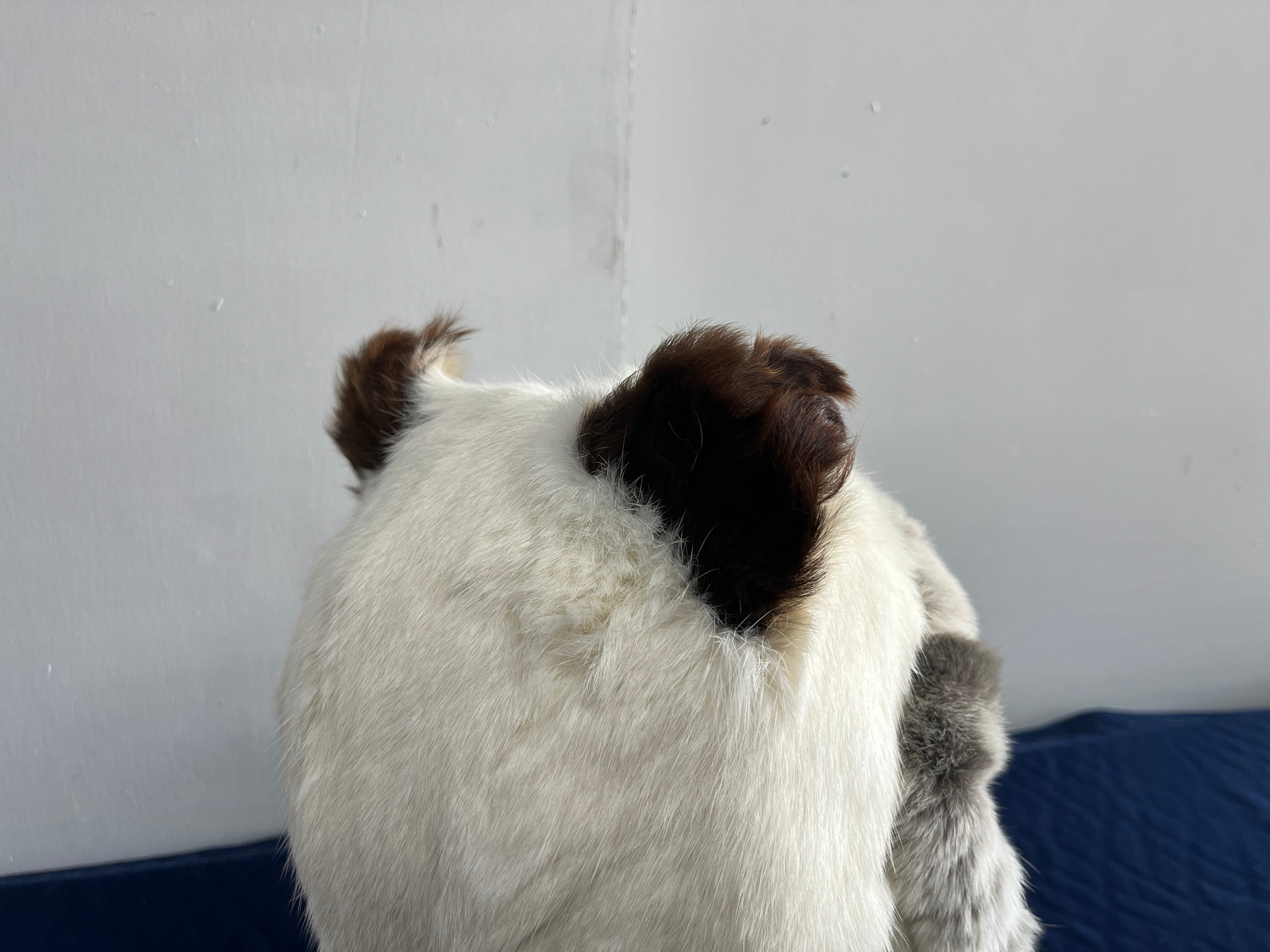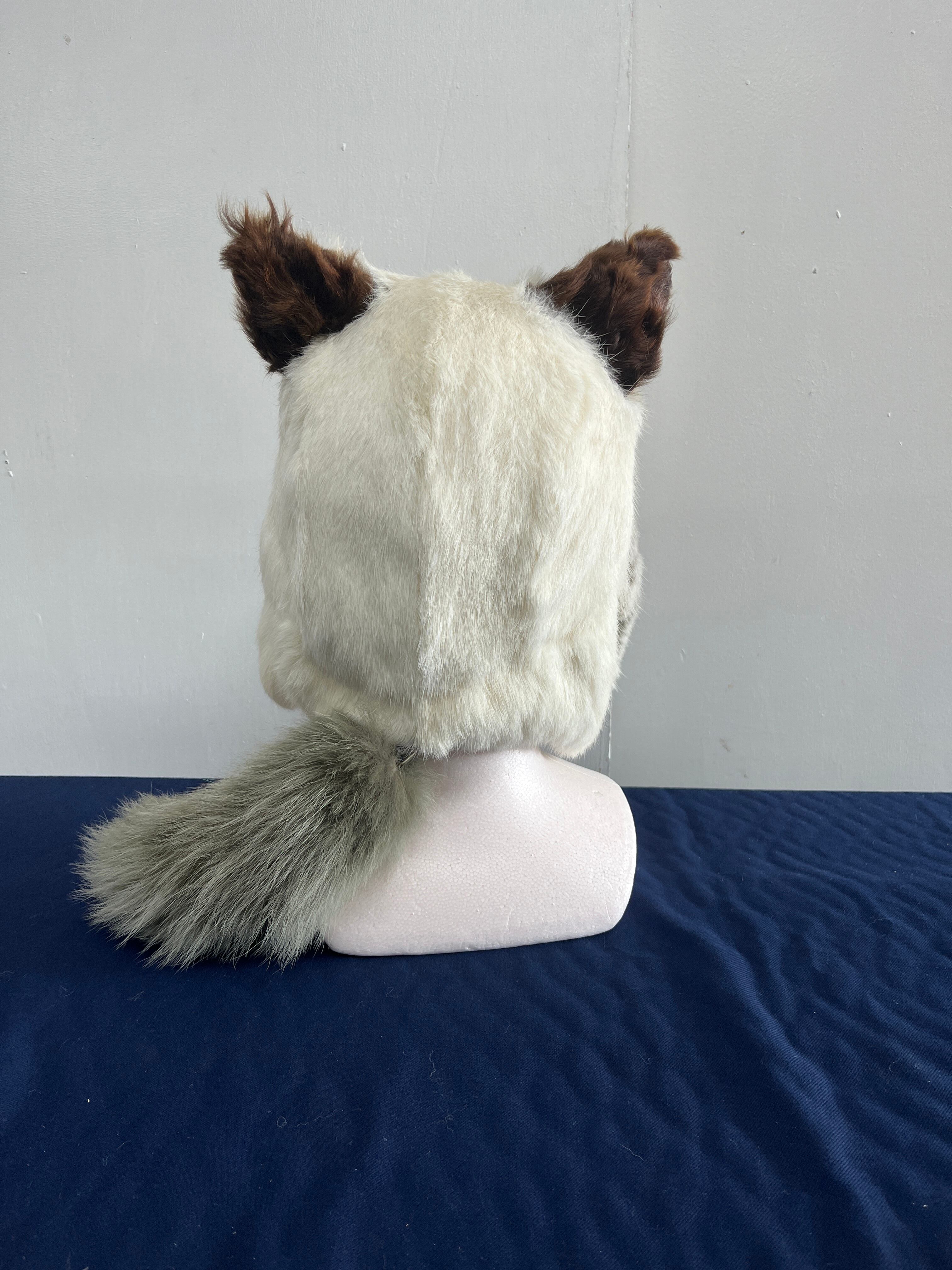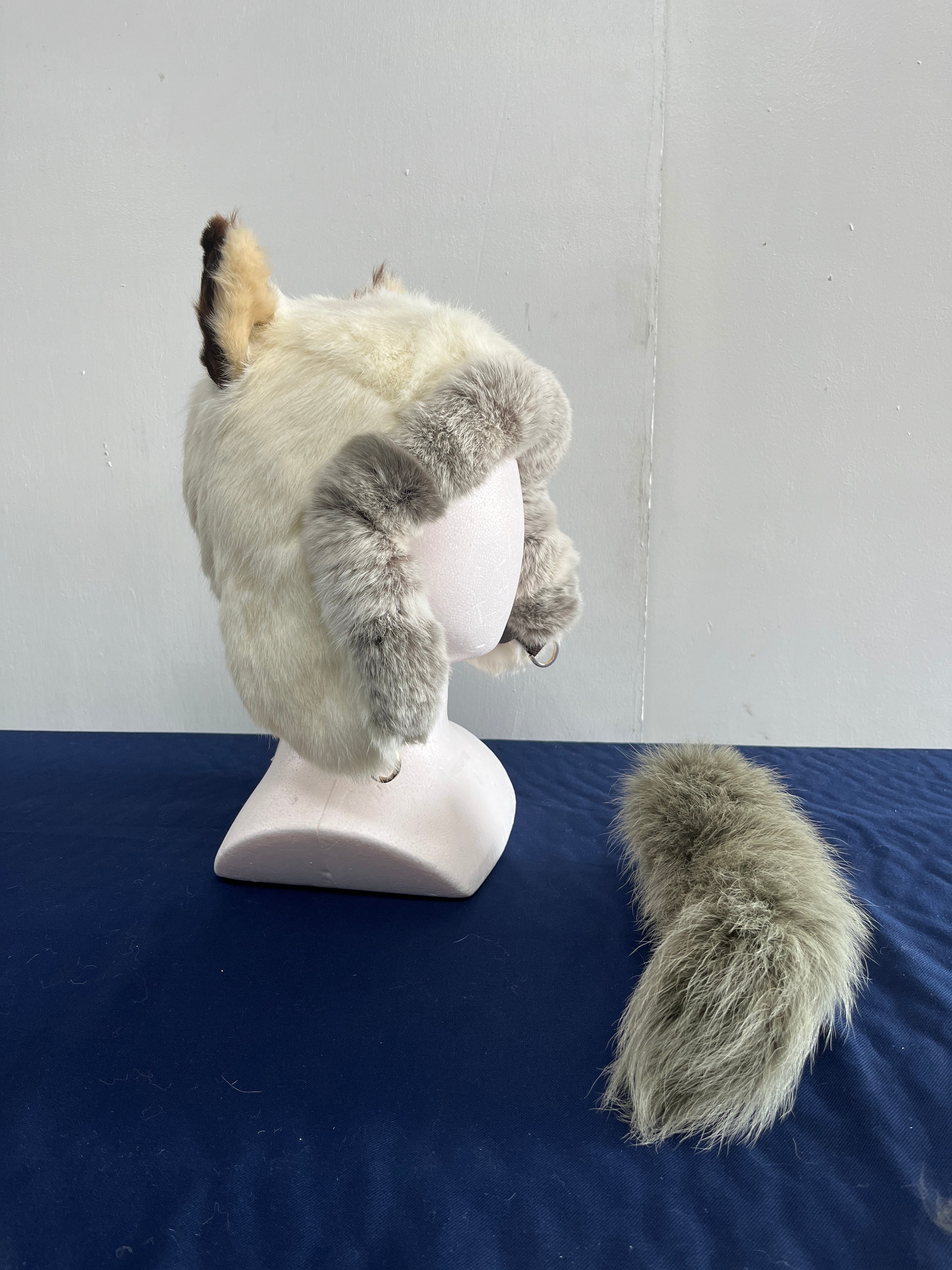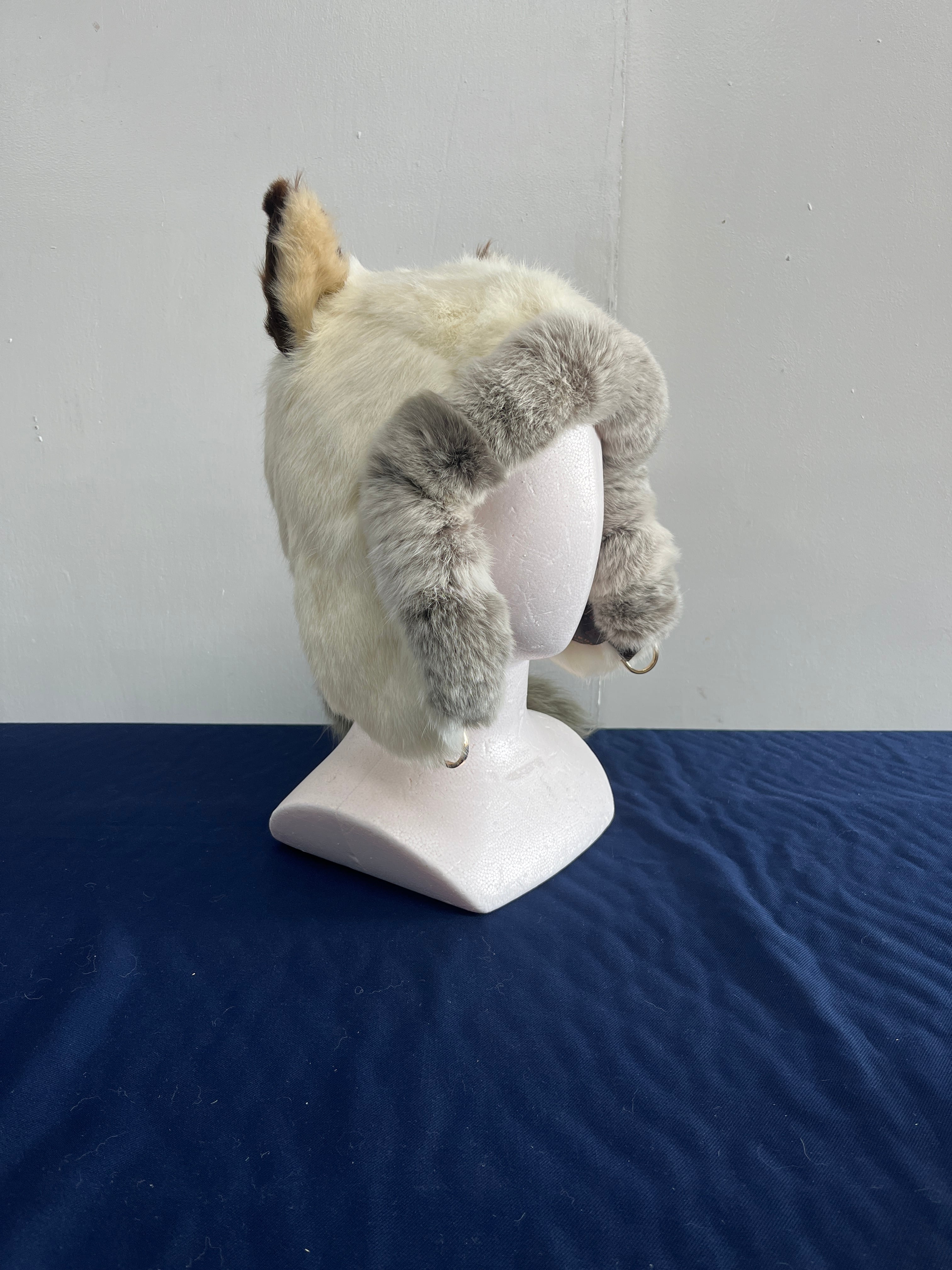 パイロット帽子 毛皮フルスキンタイプ 白ラビット+耳キッチャンラム+尻尾ブルーFox緑染め 60センチ